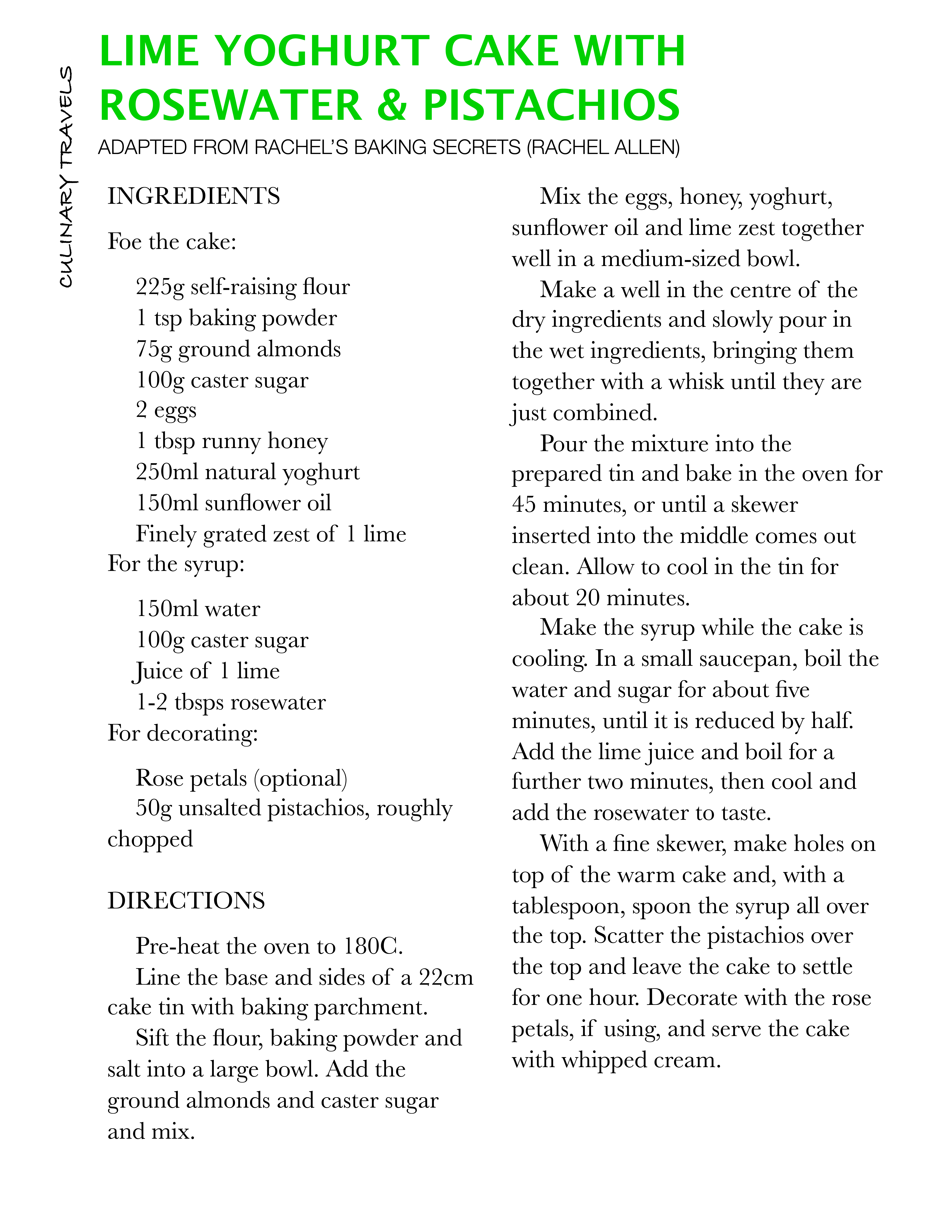 Enough about me and back to the recipe at hand. Yesterday I had a need to bake, I don’t mean I had to bake for a special occasion or for a particular event but that I had an overwhelming desire to bake, and that bake had to suit the weather – dense, heavy fruit cakes were most certainly out of the picture as were chocolate cakes as I sometimes find they can be a bit sickly in the hotter weather; only sometimes mind you. I settled on Rachel Allen’s lime yoghurt cake with rosewater and pistachios from Rachel’s Baking Secrets: From Cookies to Casseroles, Fresh from the Oven, to me the recipe shouts of the Middle East, I can just imagine myself eating a slice of this while sipping some mint tea overlooking the ocean; and then I’ll pinch myself and come out of the dream.