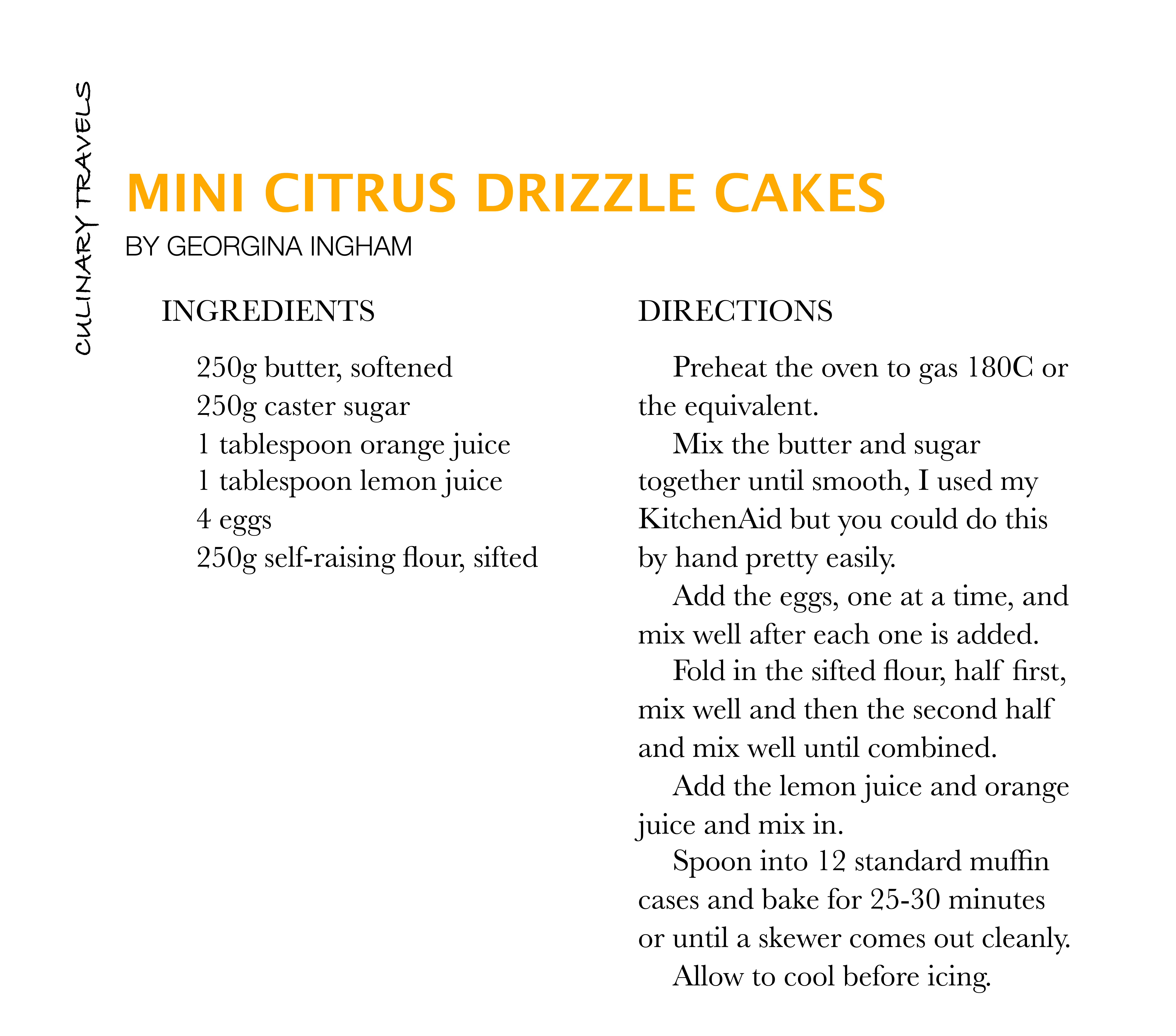 As the name implies, these lovely cakes have a tangy citrus flavour that comes from adding both lemon juice and orange juice to the cake. The citrus flavouring is also enhanced in the lemon(or orange) flavoured frosting, made with icing sugar and fruit juice, that dries to a hard crusty glaze.